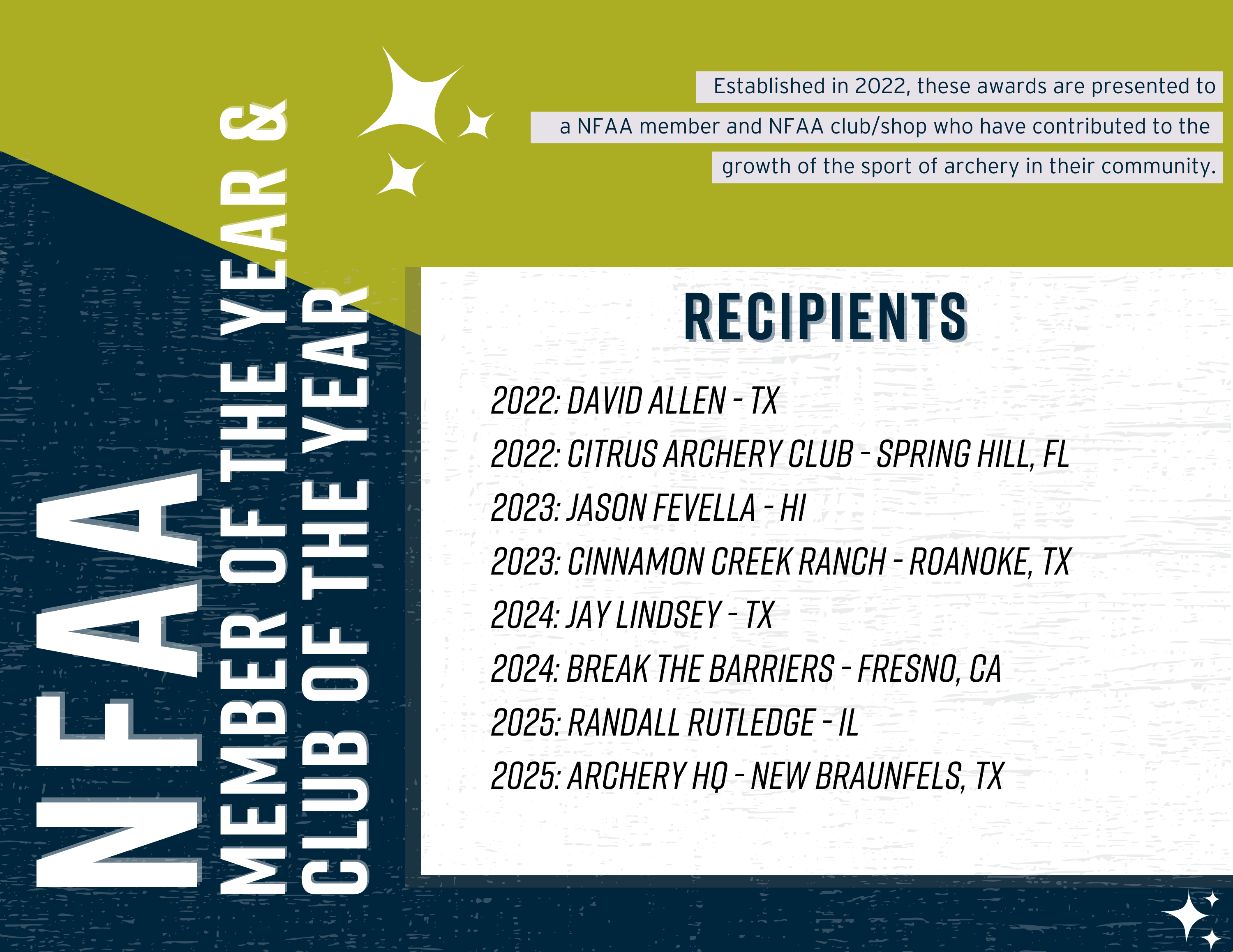 Do you know someone who has gone above and beyond in their service to the sport of archery? What about a NFAA Club or Shop in your area that has seen exponential membership growth or has become a pillar in their community due to extraordinary involvement? Each year, members are invited to nominate deserving members and clubs who have made a positive contribution to the sport of archery in their community. The selected winners receive special recognition and awards at the end of the year. To ensure broad recognition of outstanding service, an individual, club, or shop is not eligible to receive the same award if they have been a recipient within the preceding 5 years.