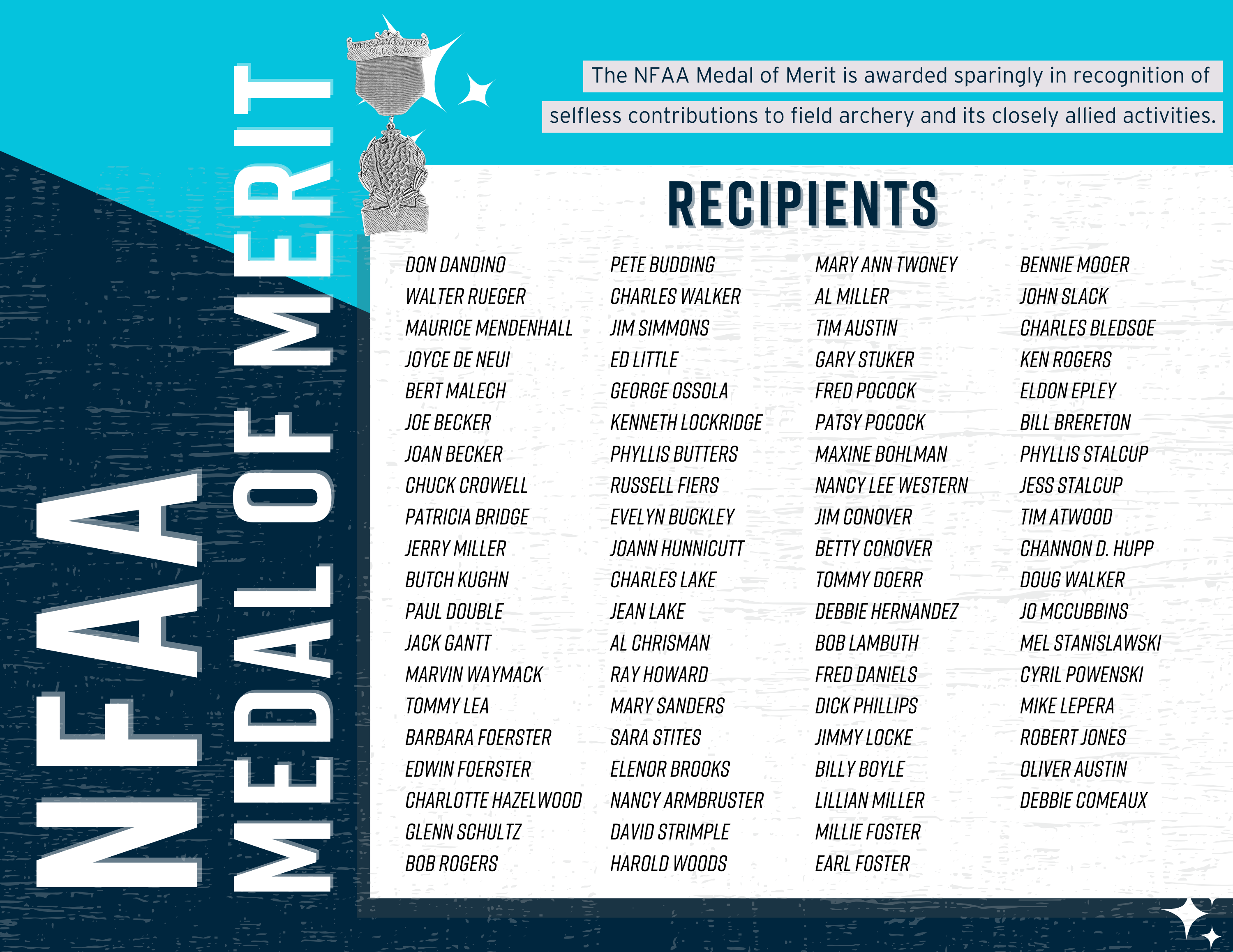 The NFAA Medal of Merit is awarded sparingly in recognition of unselfish contributions to field archery and its closely allied activities. The inscription, “Opera, Artes, Honor” (Works, Skills, Honor) which appear on the medal, serve as the measure.
